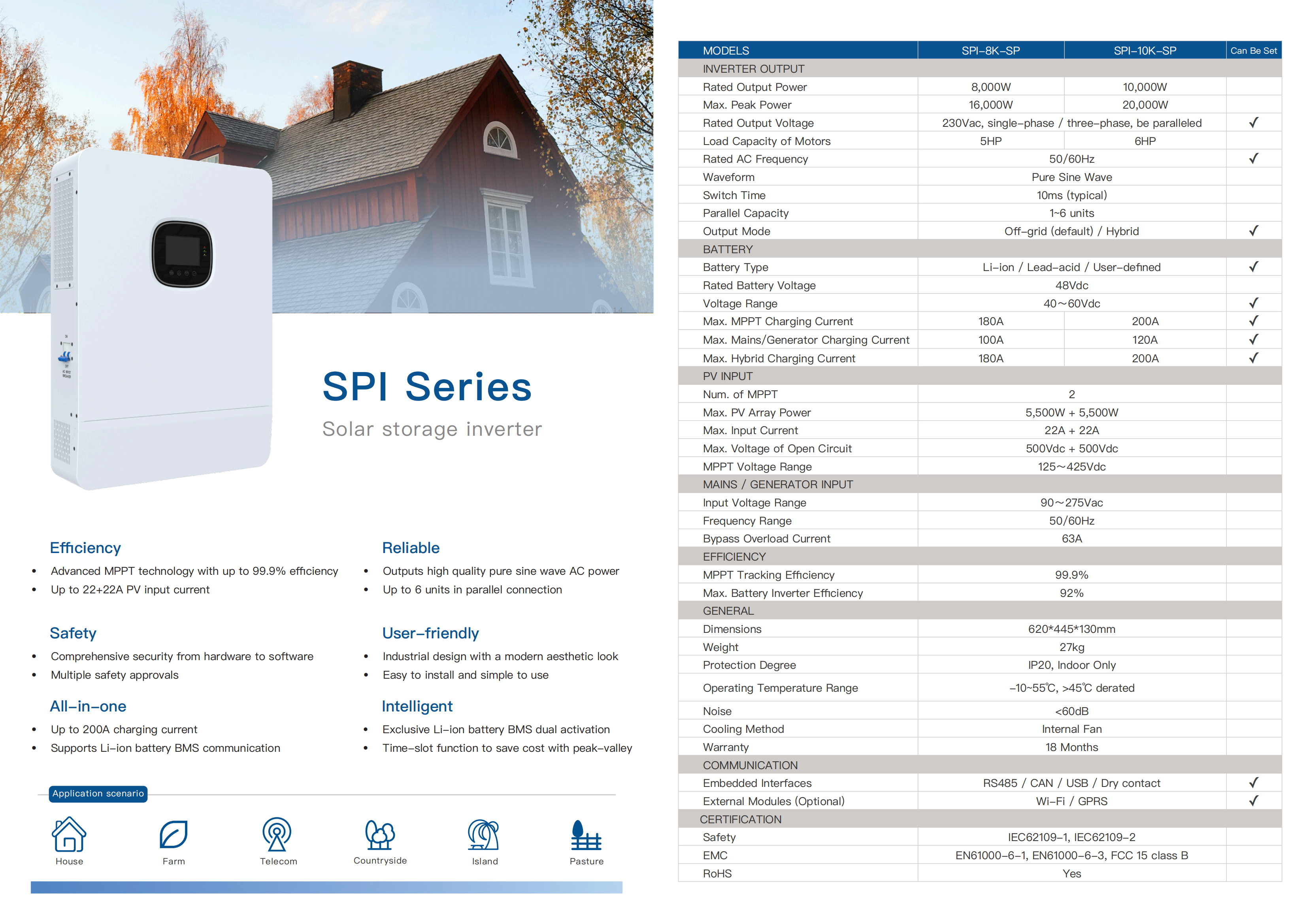 SPI series is a new type of solar energy storage inverter control inverter integrating solar energy storage & utility charging and energy storage, AC sine wave output. It adopts DSP control a features high response speed, reliability, and industrial standard through an dvanced control algorithm